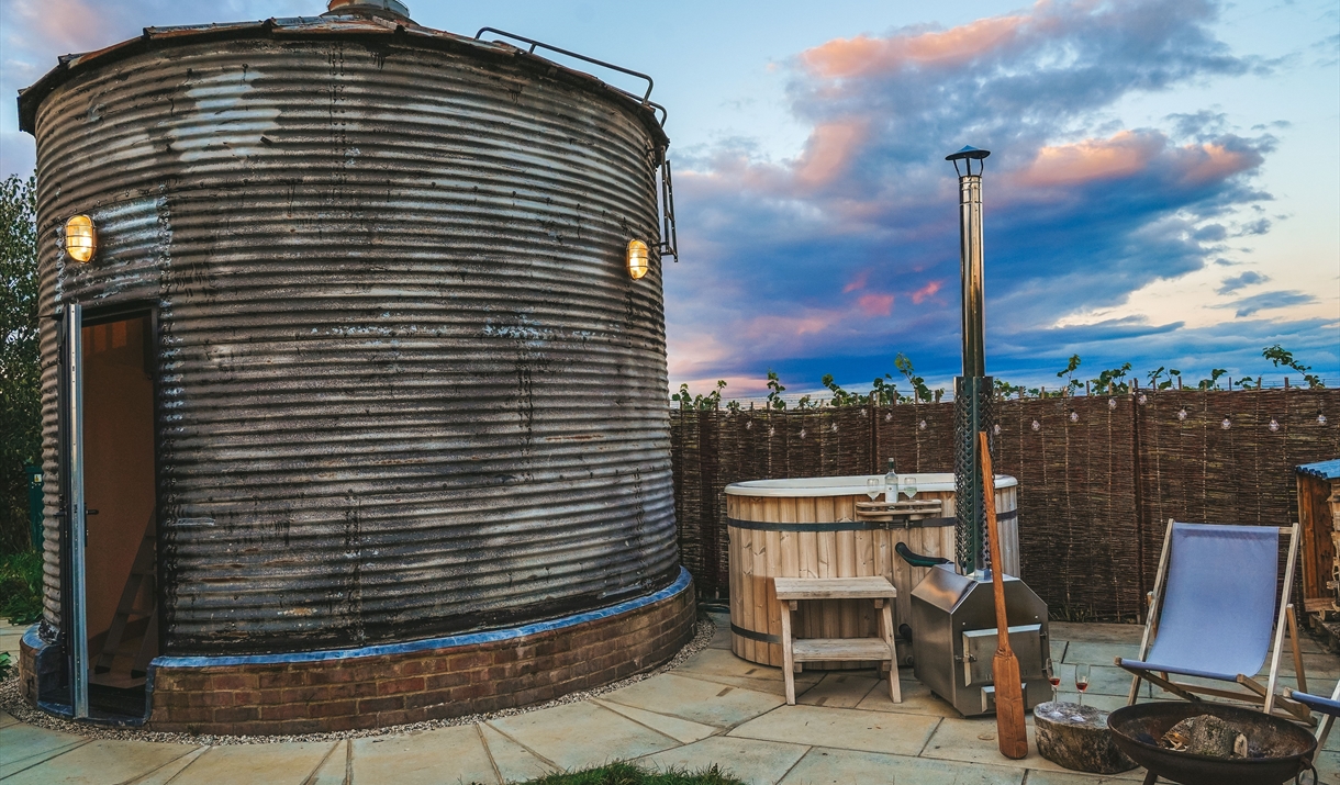 The Grain Silo is nestled within the vines on the small family-run vineyard at Tuffon Hall. Its circular, corrugated exterior overlooks fields of endlessly sprawling grape vines, boasting glorious views of the surrounding countryside. You’ll be amazed by the contrast of the inside and outside. A split-level living space awaits you, with a cosy double bed on the upper level, accessible by ladder, while the perfect little kitchen, bathroom with rainforest shower and living area are below. Relax outside in the wood fired hot tub, or cosy around the firepit as the sun sinks low, relax and pour yourself a drink of Tuffon’s very own gin or wine you may catch a glimpse of the abundant rabbits, hares, foxes, muntjac and fallow deer who hunt and graze among the vines.