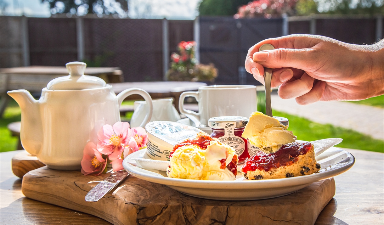 The tea room serves a range of cooked lunches, sandwiches, hot and cold snacks, and Tiptree Patisserie cakes. Try the special Tiptree Cream Tea: two homemade fruit scones with Tiptree Little Scarlet Stawberry preserve and Rodda's classic Cornish clotted cream. Served with your choice or tea or filter coffee.