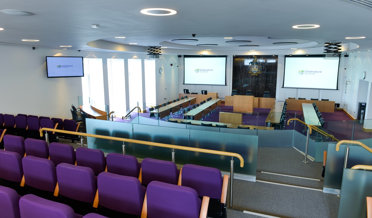 The Council Chamber holds up to 200 people with an auditorium that holds 124 and a flexible floorspace in front where various layouts can be achieved.