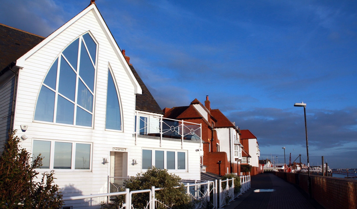 7. Turn left and now you are on The Promenade. Continue along the Quay towards the White Art Deco building which is the Royal Corinthian Yacht Club (RCYC).